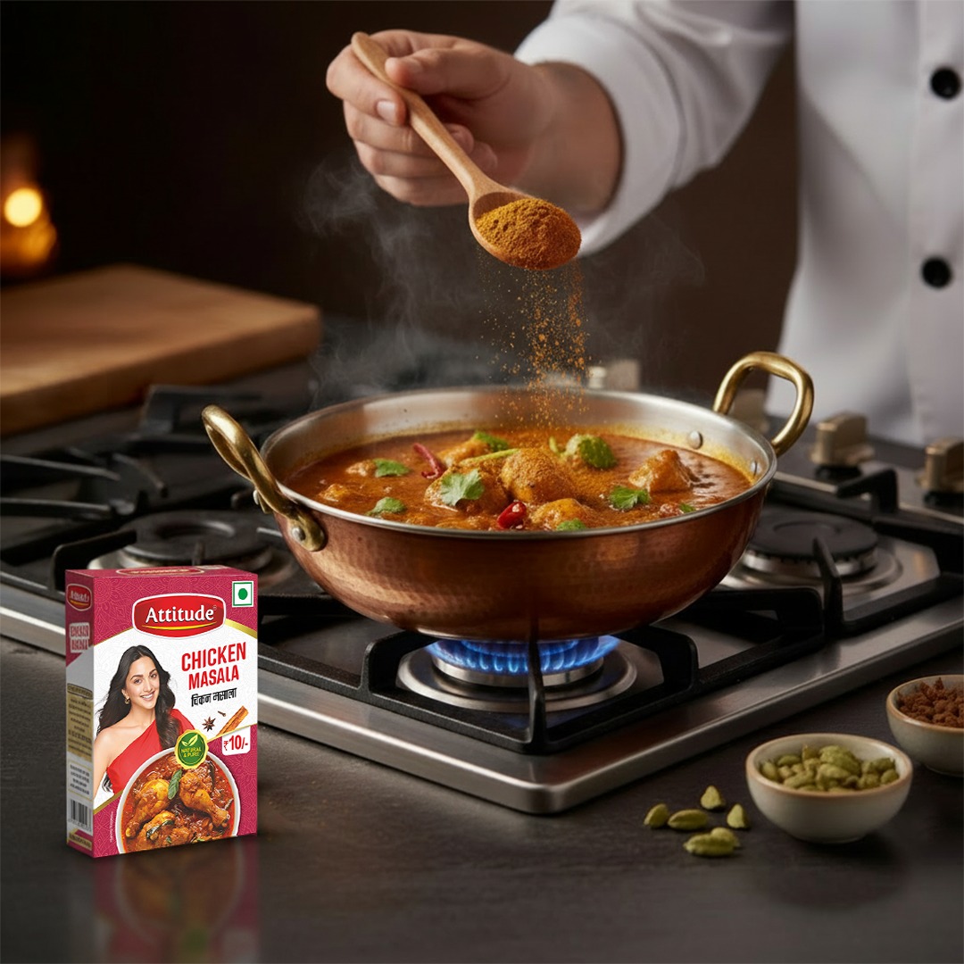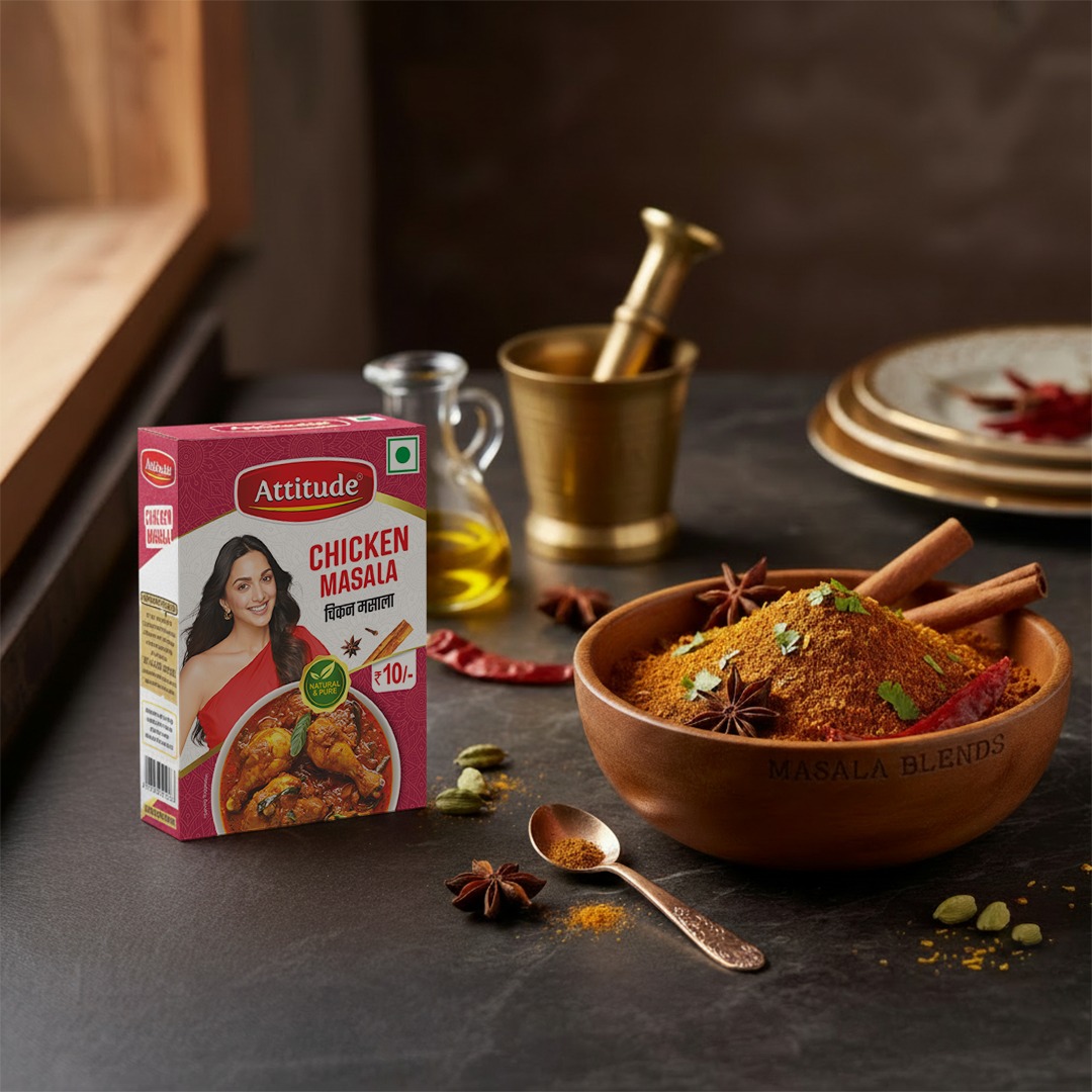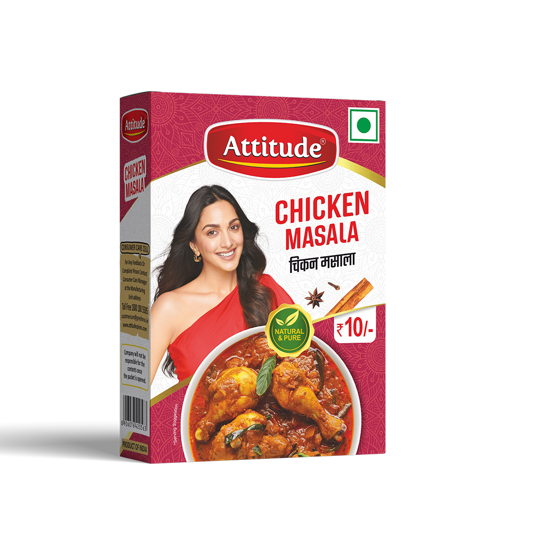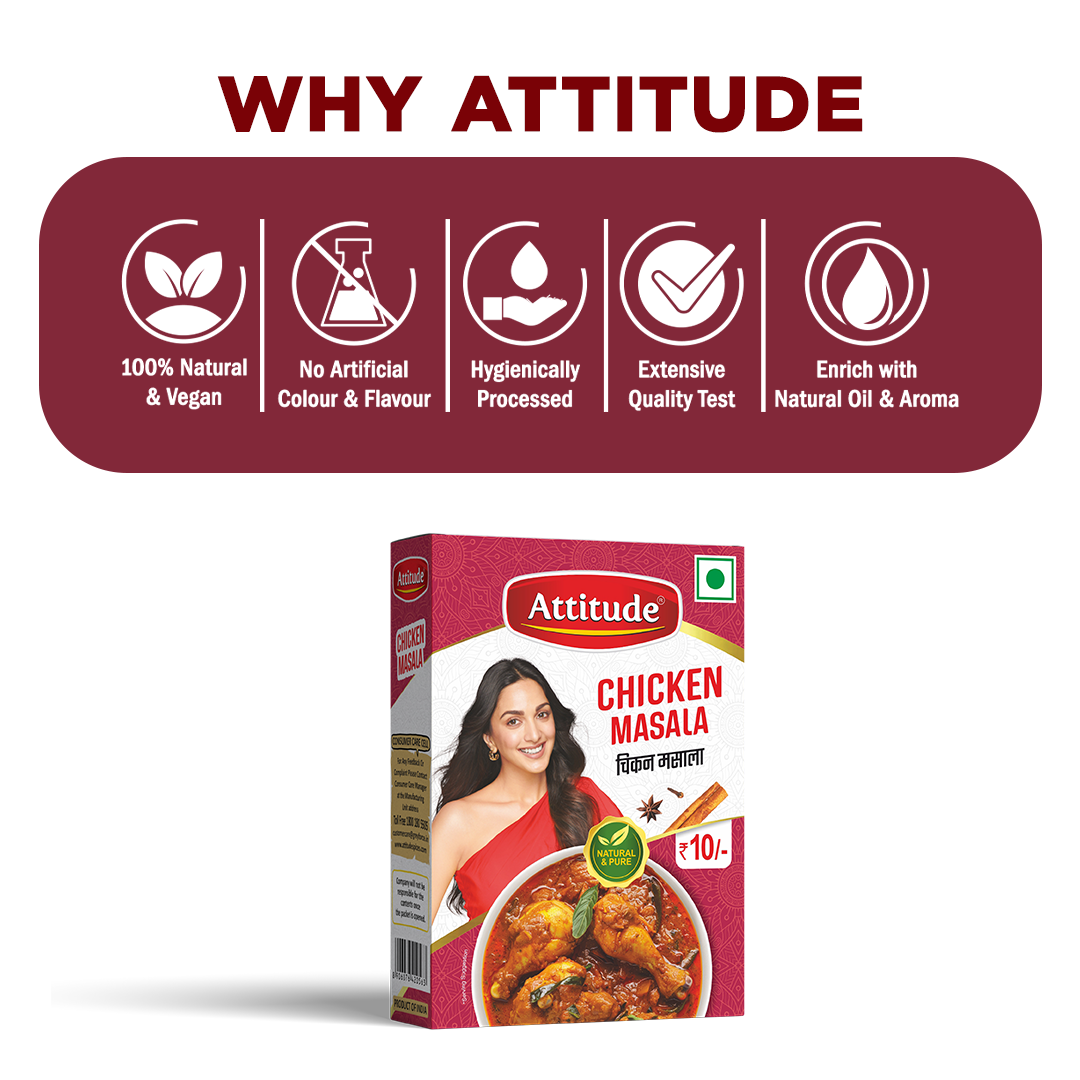 Attitude Chicken Masala made from 100% Pure and Natural spices sourced directly from spice growing area, free from any artificial colour and added preservative and flavour, our spices is carefully grounded which preserve aroma and flavour and make your dish more aromatic and flavourful and creamy.Perfect Blends of Aromatic spices which elevate your vegetables & curries.