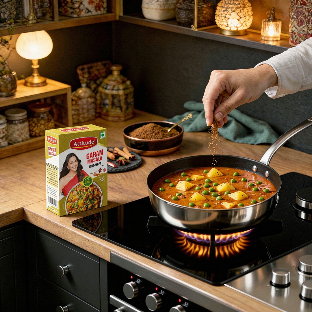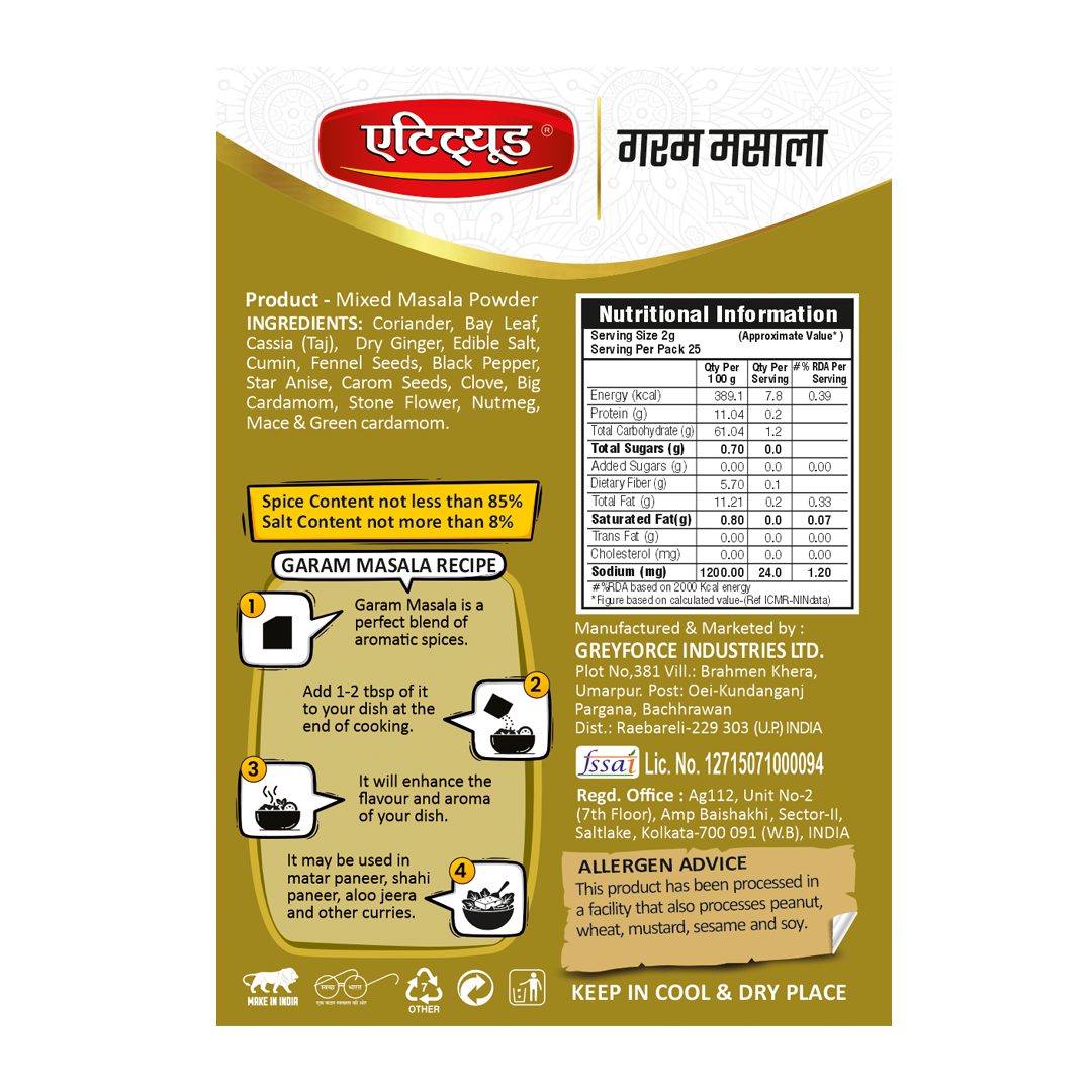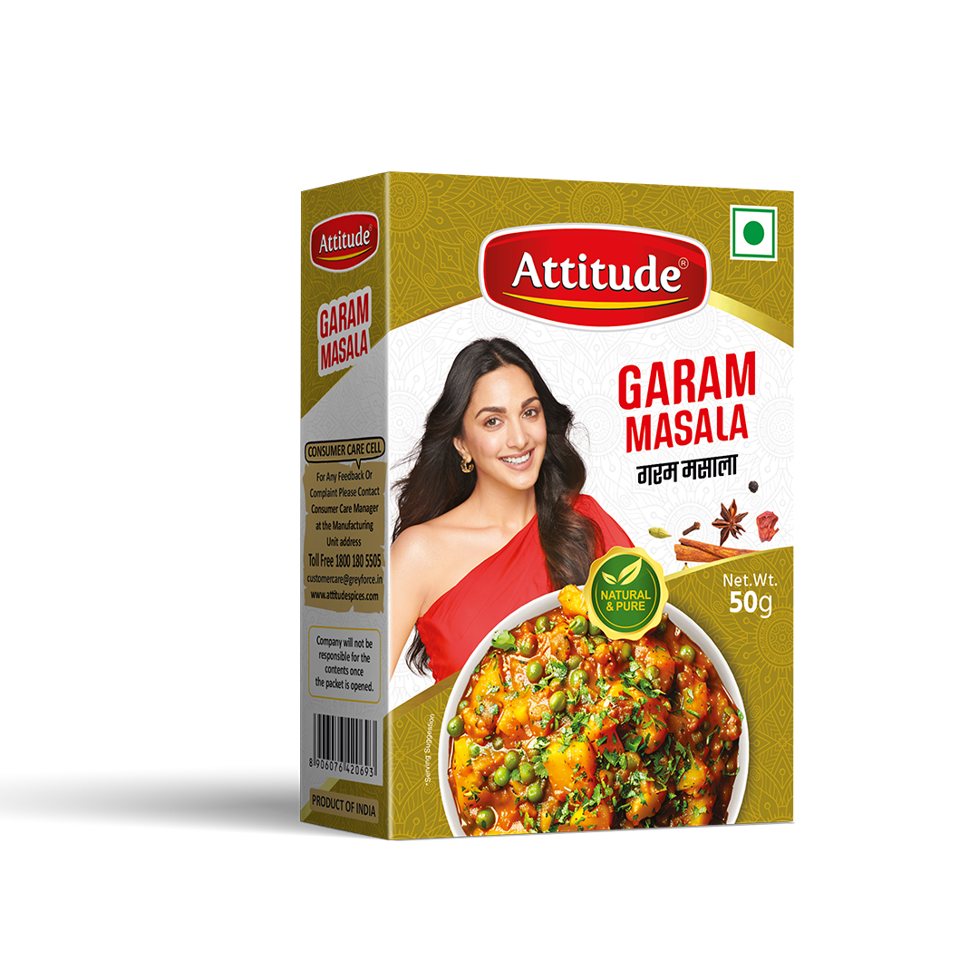 Attitude Garam Masala is a perfect blend of aromatic spices. Add 1-2 tablespoons at the end of cooking to enhance the flavour and aroma of your dish. It’s ideal for use in Mutter Paneer, Shahi Paneer, Aloo Jeera, and other curries.